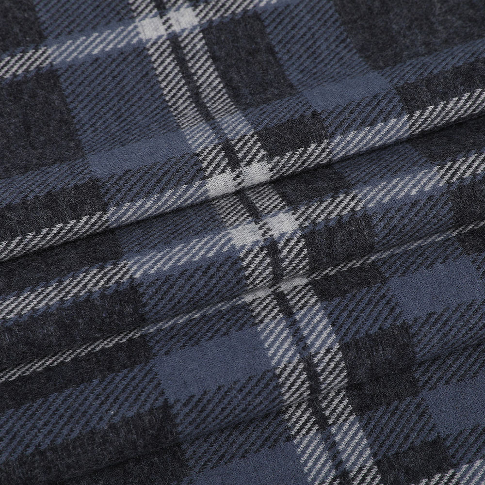 Jacquard double-sided fabrik rajutan bulu lembut lembut dan selesa diperbuat daripada bahan mentah yang dipilih melalui teknologi berkadar halus dan canggih. Komposisi kain adalah 50% bulu, 30% sutera berputar, dan kapas 20%. Nisbah saintifik ini memastikan bahawa kain itu mengekalkan prestasi penebat haba yang baik sementara juga mempunyai kebolehkerjaan dan keselesaan yang baik. Sebagai komponen utama kain, Wool memberikan kehangatan dan kebolehkerjaan yang baik, membolehkan kain tetap selesa dalam persekitaran sejuk. Penambahan sutera berputar dengan ketara meningkatkan gloss dan kelancaran kain, dan pada masa yang sama meningkatkan kelembutan dan keramahan kulit kain, menjadikan pengalaman memakai lebih menyenangkan. Penambahan kapas terus meningkatkan ketahanan dan hygroscopicity kain, memastikan ia tetap kering dan selesa selepas memakai jangka panjang. Proses Jacquard dua sisi merupakan kemuncak kain ini. Melalui teknologi tenunan ketepatan, kedua-dua bahagian depan dan belakang menunjukkan corak kotak-kotak yang halus dan seragam, yang bukan sahaja meningkatkan kesan visual kain tetapi juga meningkatkan lapisan dan tiga dimensi kain. Proses unik ini membolehkan kain untuk menunjukkan perubahan cahaya dan bayangan yang kaya apabila terdedah kepada cahaya, meningkatkan rasa fesyen dan nilai hiasan kain.